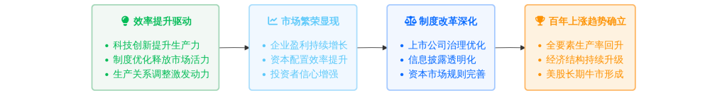 - 推动美国股市百年上涨的核心动力是效率提升,可来自科技、制度或生产关系任一环节。