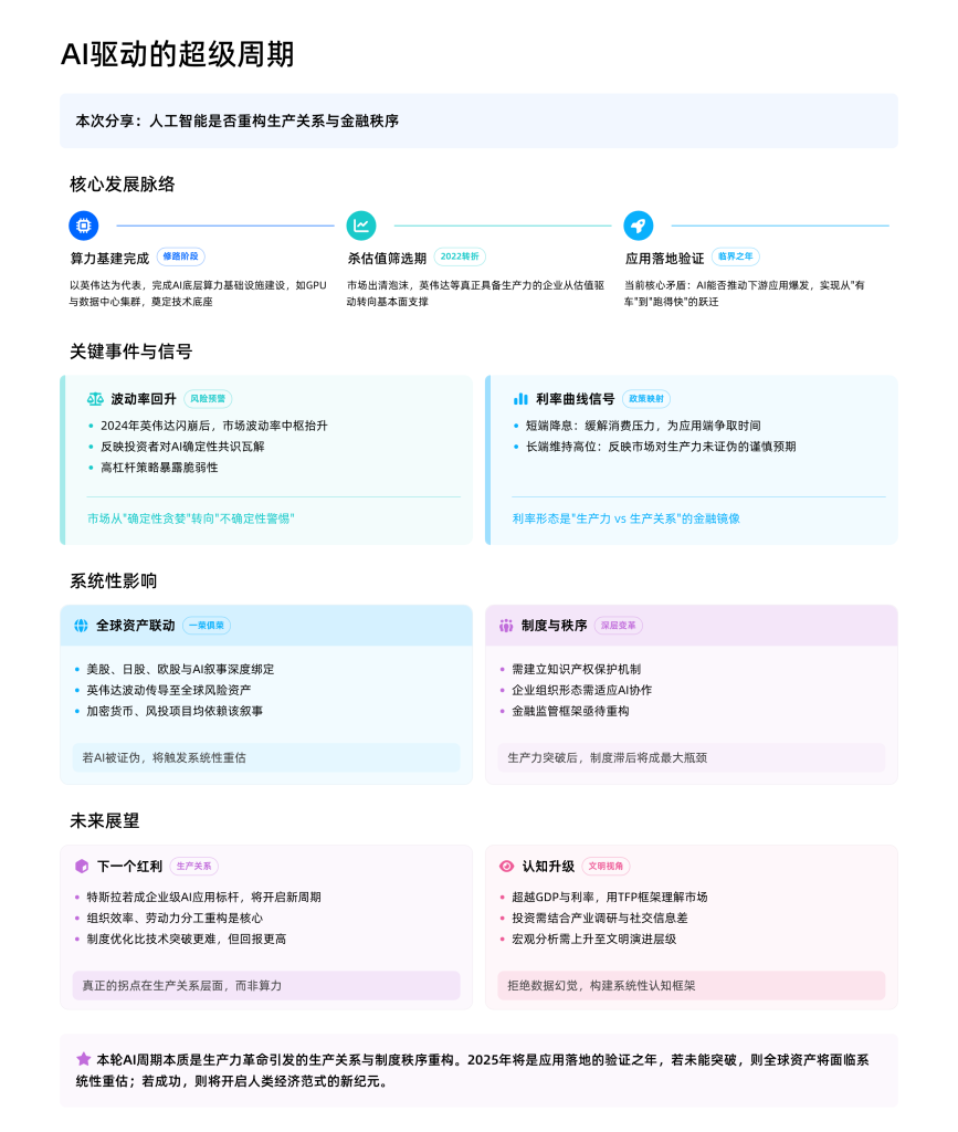 本次演讲核心议题是人工智能驱动的超级周期及其对全球经济与资产价格的深远影响。当前正处于一个可能持续十余年的结构性大周期关键节点,其核心在于生产力能否真正改变生产关系。AI的发展已走过算力基础设施建设阶段(如英伟达为代表的“修路”),进入应用端“有车跑”的验证期。市场长期走势本质上反映的是全要素生产率(TFP)的提升,而非单纯的GDP增长或利率变化。历史经验表明,美股每一轮长期牛市均源于效率提升,包括科技进步、制度变革或生产关系优化。2015–2016年是上一轮周期的起点,当时美国通过修复各部门资产负债表并推动制度改革,开启了以AI为代表的新一轮技术革命。2022年为“杀估值”之年,市场筛选出真正的生产力标的,英伟达等企业证明了其从游戏显卡向算力平台的转型。此后,资本高度集中于确定性赛道,但也催生了过度杠杆和波动风险。2024年英伟达闪崩事件暴露了市场贪婪与脆弱性,波动率回升预示不确定性上升。当前全球资产定价的核心矛盾在于:AI是否仅为泡沫,还是能真正带动下游应用、重构生产关系与制度秩序。若明年应用端无法实现突破,则全球资产将面临系统性重估;反之,则将迎来生产关系乃至金融秩序的全面变革。