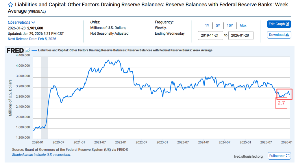 2.银行准备金:这是目前最关键的水池。历史经验表明,一旦银行准备金规模跌破约2.7万亿美元的警戒线,美国货币市场就会立刻爆发流动性危机(SOFR利率飙升)。目前银行准备金余额就在这一危险水平附近徘徊。